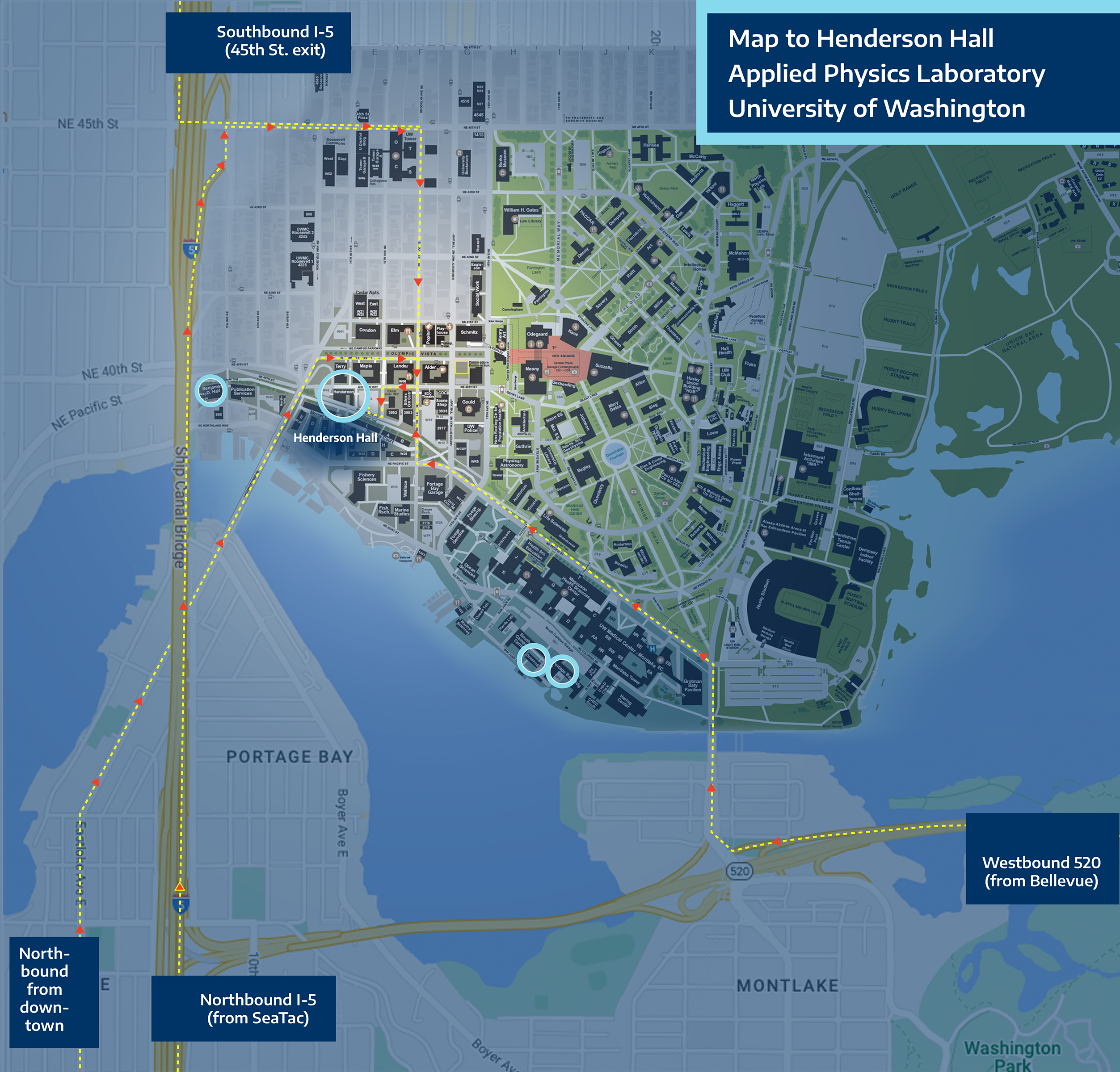 APL-UW staff work in four (4) buildings on the University of Washington campus. Written driving directions are given to Henderson Hall. Map-based directions are provided for Henderson Hall and for driving / walking routes between Henderson Hall and other APL-UW facilities. |